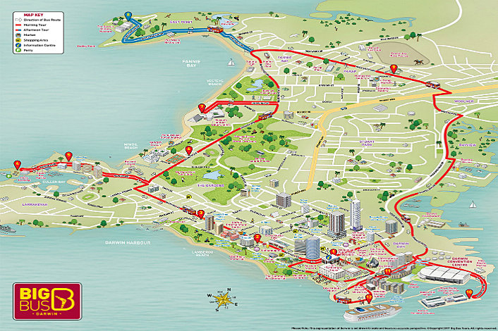 Major stops include: Crocosaurus Cove, Cullen Bay Jetty, Mindil Markets and Casino, Military Museum, Parap and the Waterfront Precinct. Full details of the stops are:
